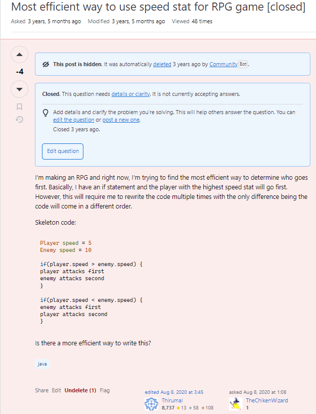 Because of this, I decided to ask stack overflow (because ChatGPT wasn’t out yet) and see what the internet had to say. I essentially asked them, “Hey, here’s my code, how do I make it more efficient?” I had just assumed people would understand what I meant by more efficient, being able to condense the 4 copy and paste blocks of combat into 1. Instead, they thought I meant I was asking how to make my 10 line block of code run faster. They were visibly confused too because the actual solution was so simple that they didn’t think I’d be that stupid. Here is an answer to my post that exemplifies this perfectly: “Use an “else”? (And handle if they’re equal.) I’m not sure what you’re asking, though; more efficient in what sense? You could keep player reference and swap their order, but without any context it’s difficult to know what kind of answer you’re expecting. – Dave Newton Aug 8, 2020 at 1:22”. Unfortunately, I can’t post the link to the actual question itself because it was deleted, but I feel like this question that I posted was so perfect for this essay that I just had to include it somehow.
